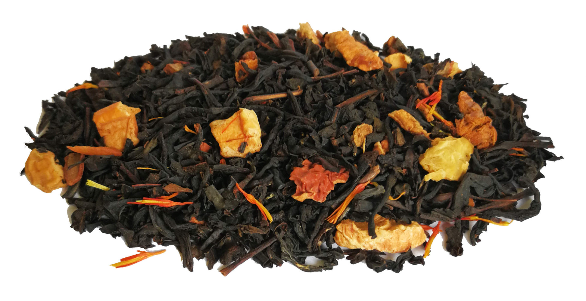 Ett svart te med smak av knäck och toner av äpple och kryddor. Dekorerat med äppelbitar, kanel och safflor