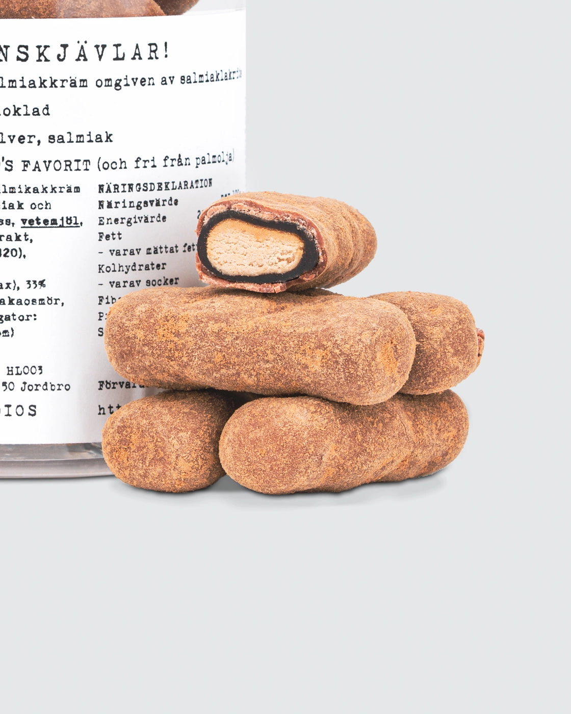 Här har vi doppat Svenskjävlar i i belgisk mjölkchoklad och rullat dom i salmiakpulver.