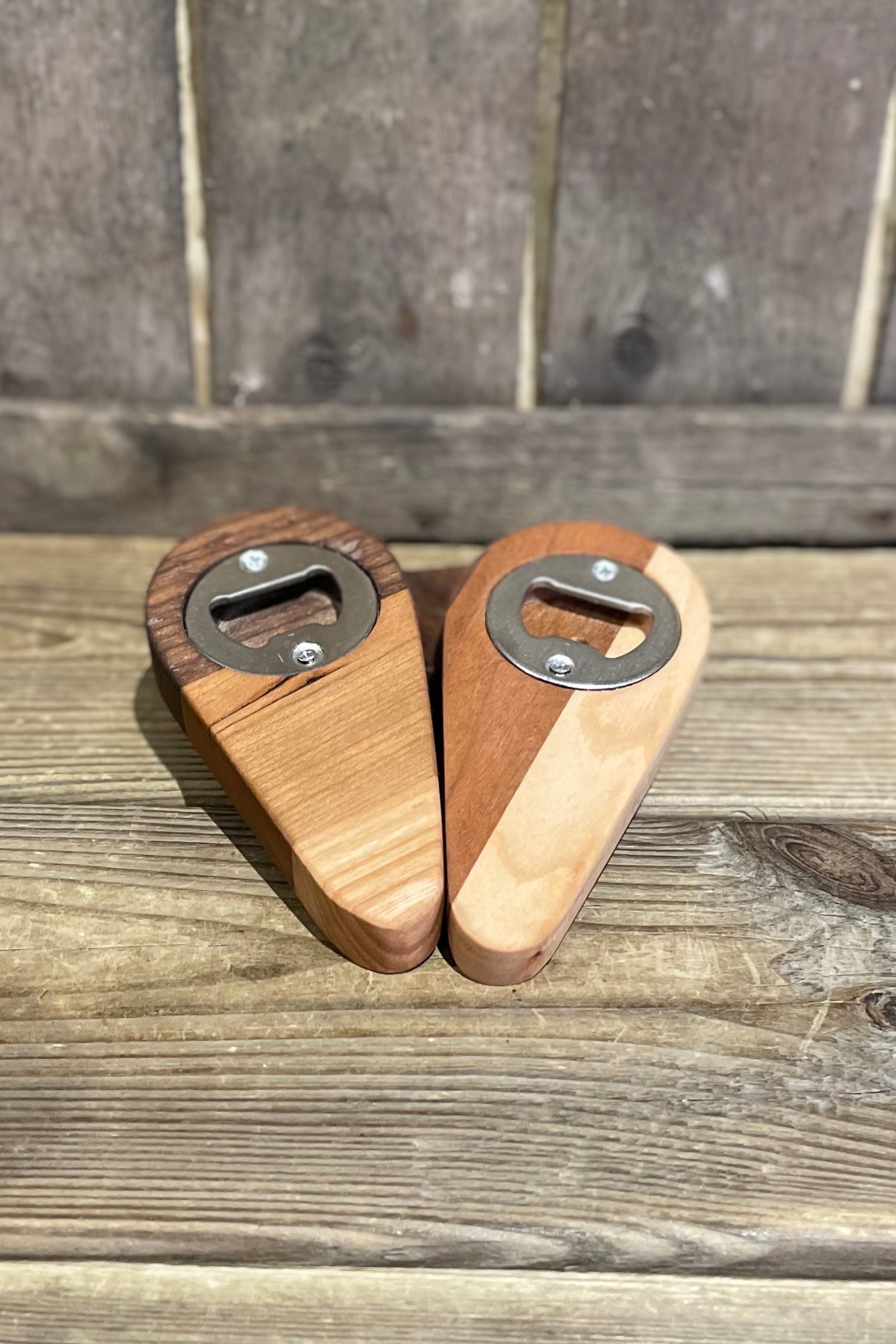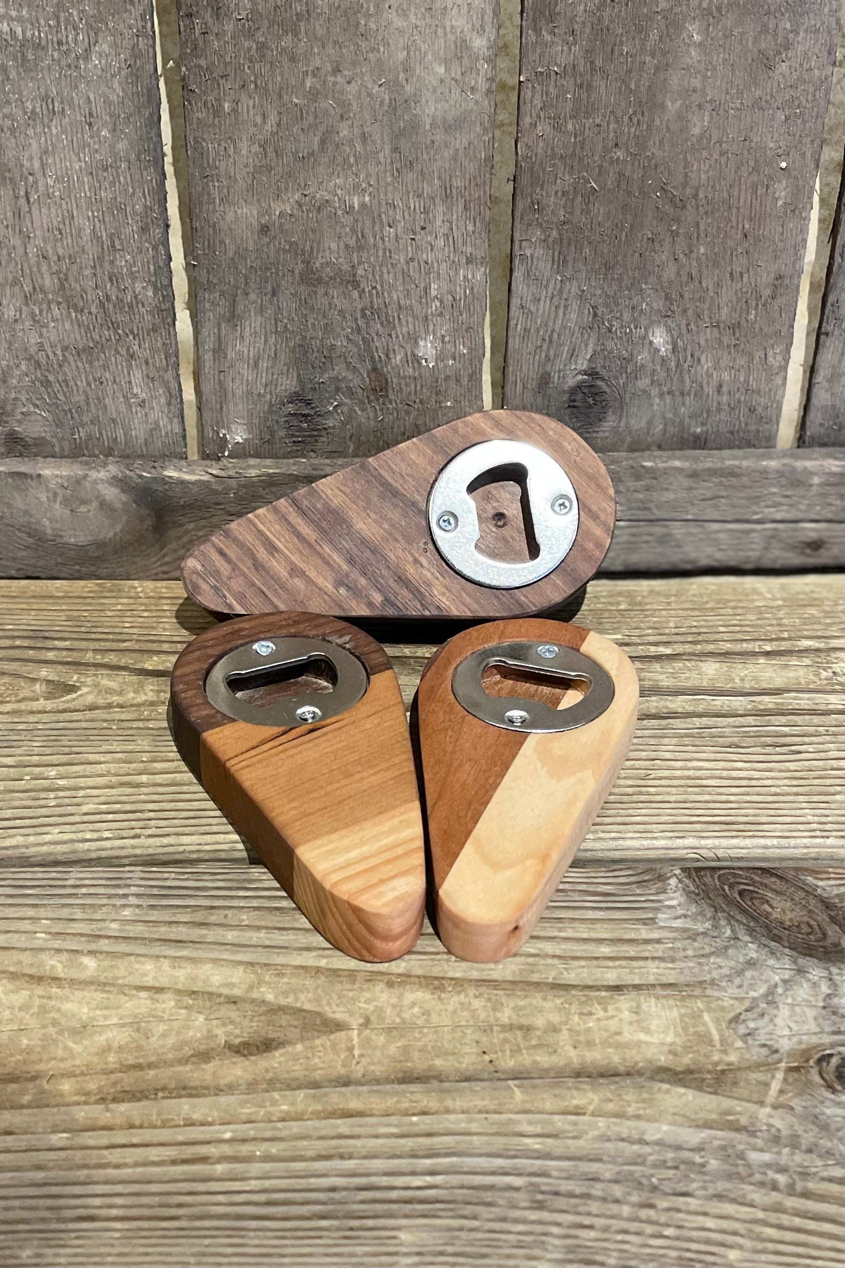 Lokal, handgjord kapsylöppnare i trä. Kan variera i färg och storlek.