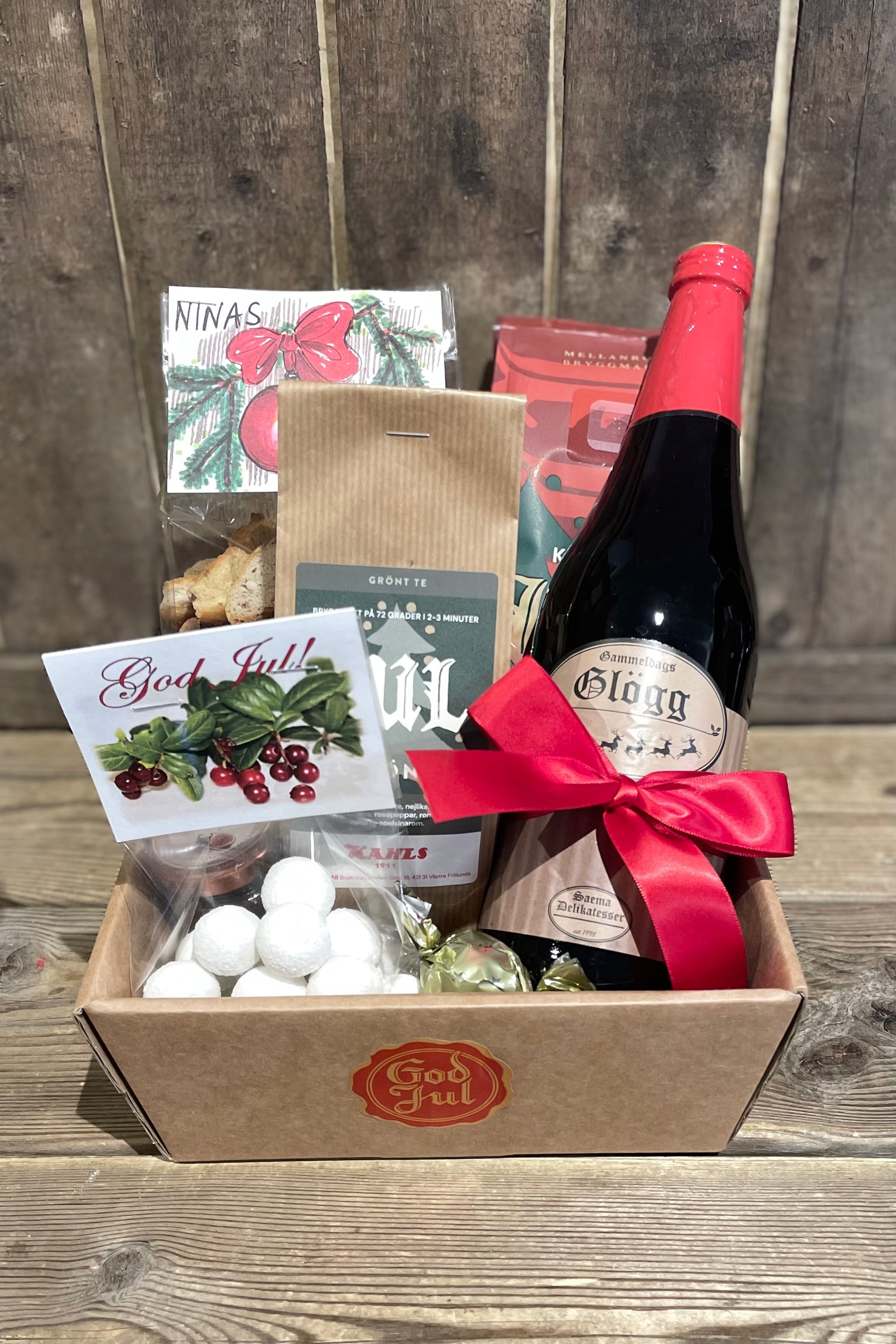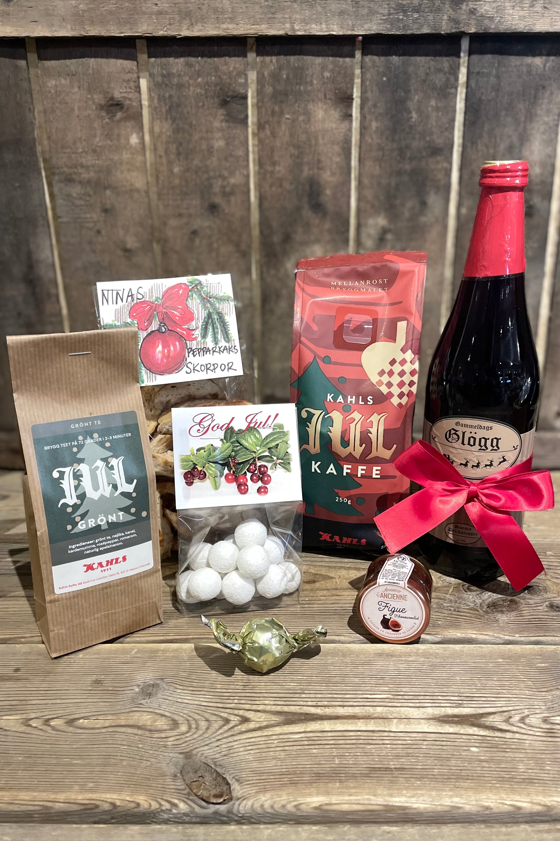 Julgrupp innehållande pepparkaksskorpor, julkaffe, julte, gammeldags glögg, fikonmarmelad, snöbollar med marsipan/nougat och chokladpralin.
