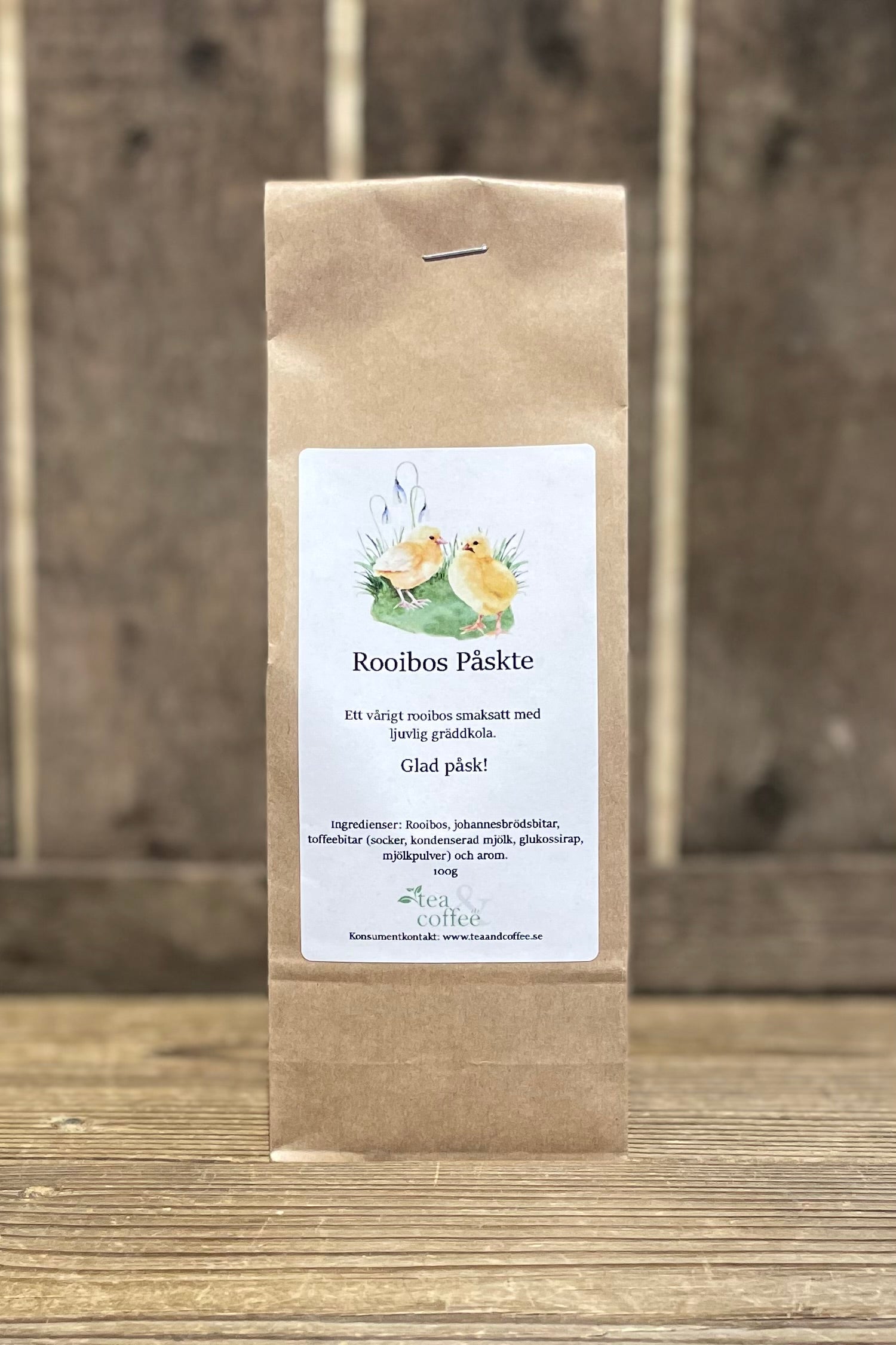 Rooibos, johannesbrödsbitar, toffeebitar (socker, kondenserad mjölk, glukossirap, mjölkpulver) och arom.