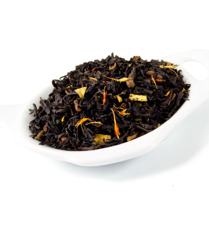 Svart te från Indien & Kina, kanel, kardemumma, nejlika, citrusskal*, naturlig apelsinarom, safflor, svartpeppar, ingefära*, gräddarom